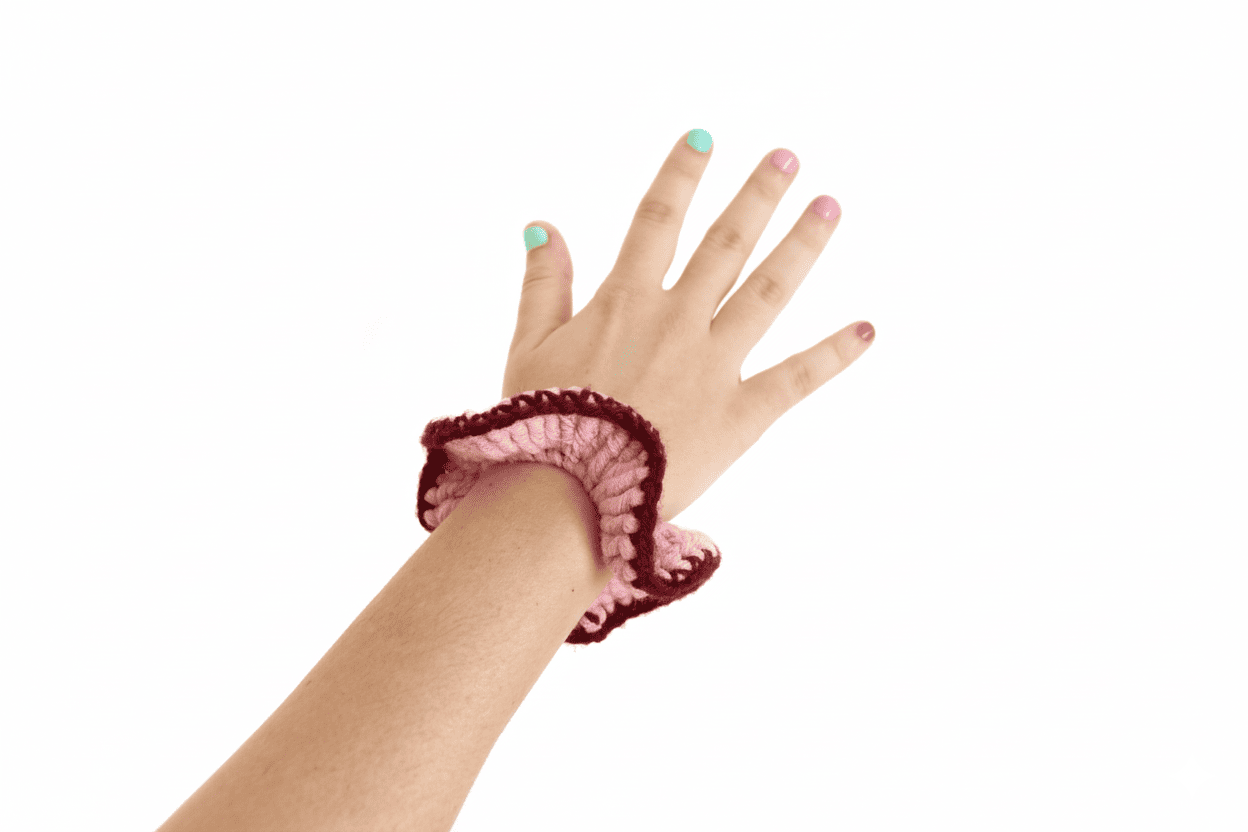 Este coletero tipo scrunchie está tejido a mano con hilo de tacto suave en un delicado tono rosa pastel, rematado con un elegante borde granate (vino tinto) que le aporta contraste y estilo. Ideal para quienes buscan accesorios con personalidad y encanto artesanal.